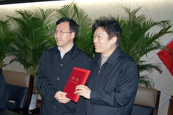 武漢市科協(xié)主席盧光發(fā)(右)向特聘院士鄧子新(左)頒發(fā)聘書